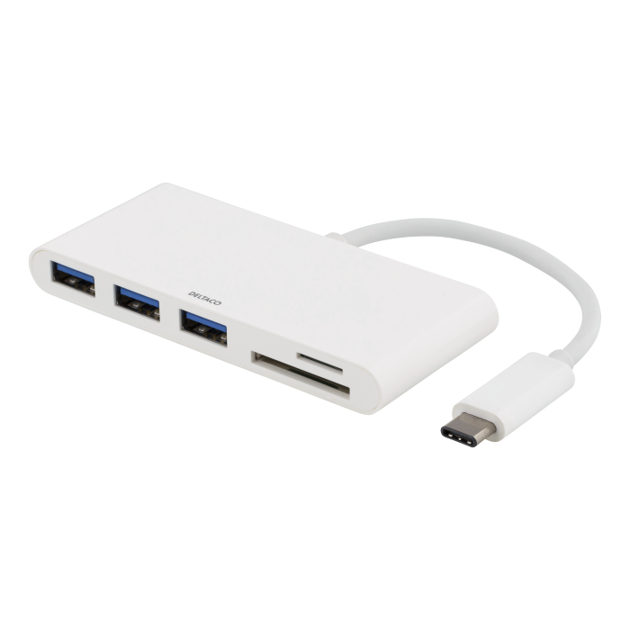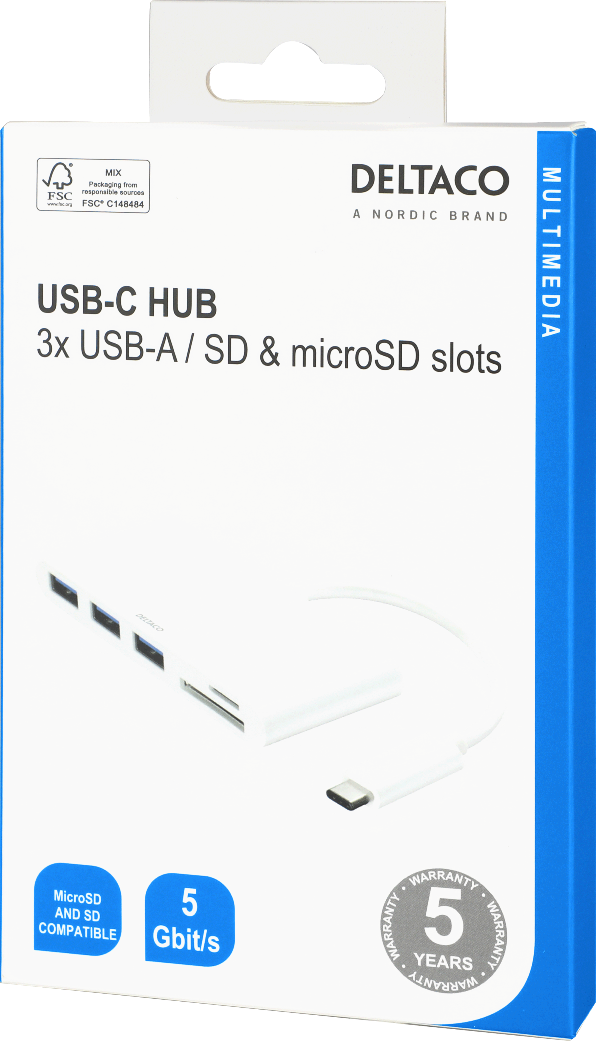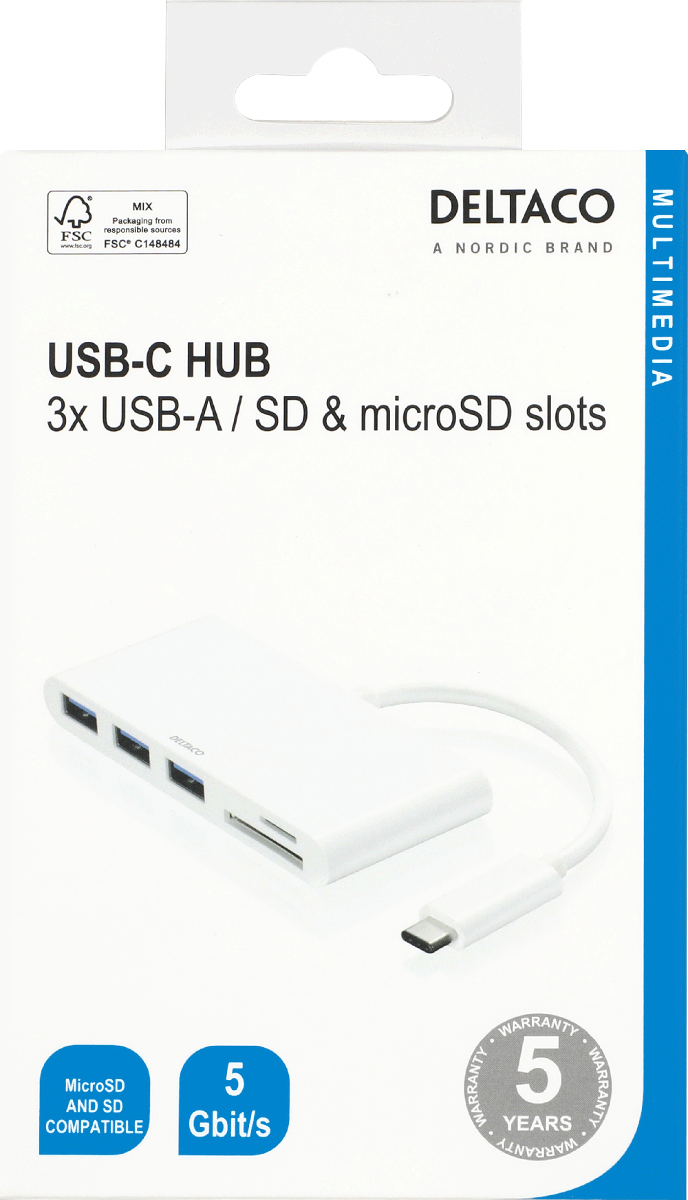 USB-C hub, USB-C 5 Gbps, 3x USB-A, SD/microSD reader, white