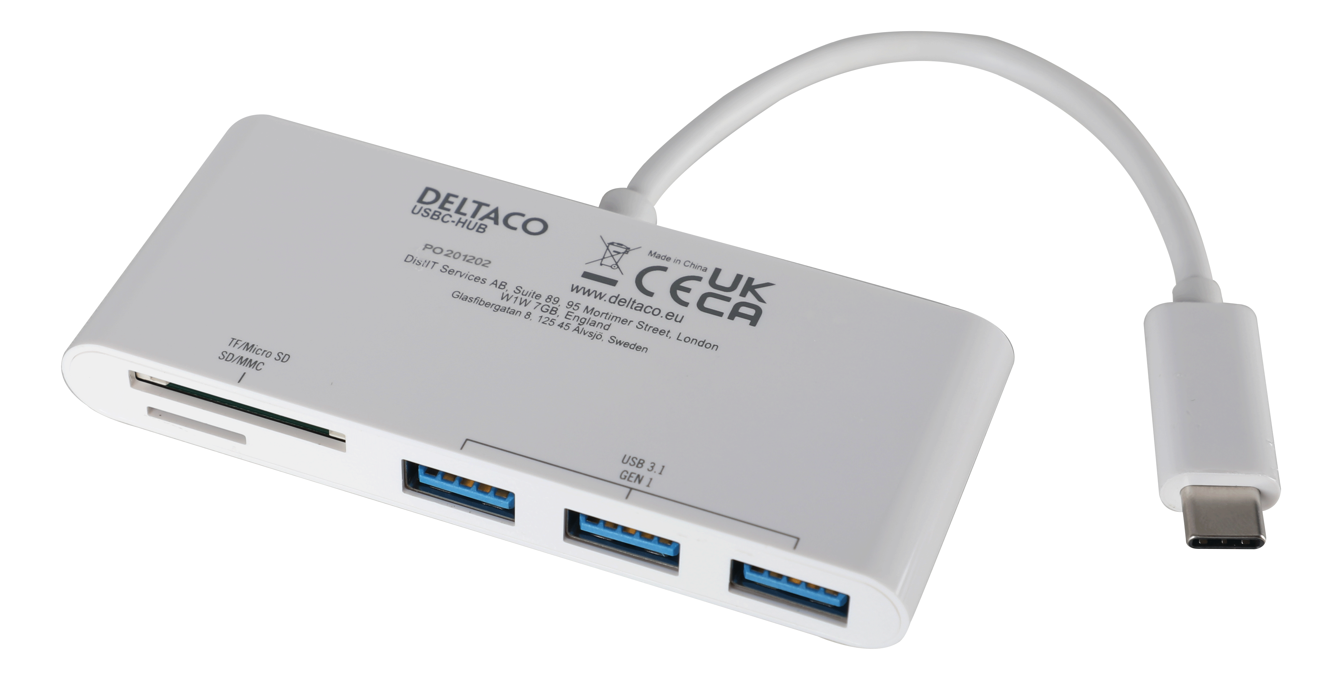 A handy USB hub with a USB-C male connector that gives you the ability to give your USB-C device, such as a laptop, three extra USB-A 5 Gbps ports and the ability to read your memory cards.